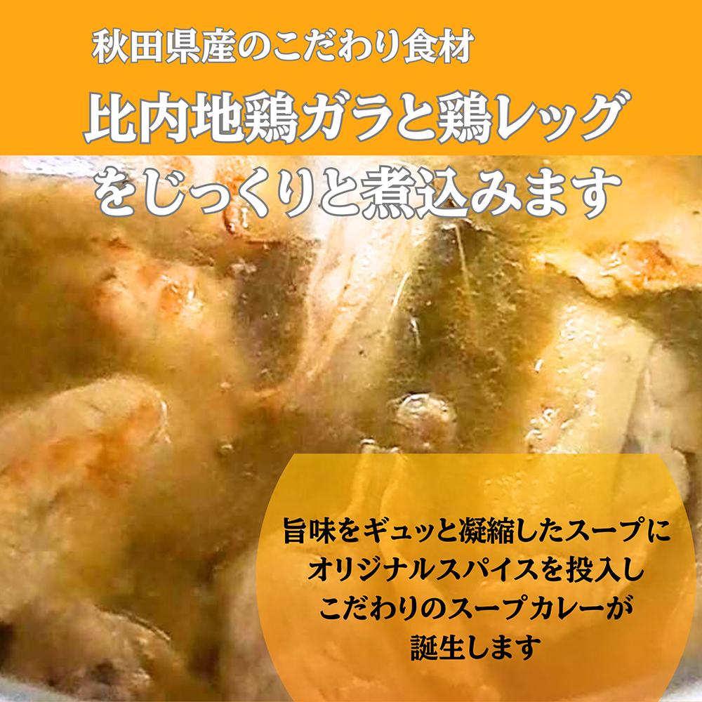| 原材料 | 骨付き鶏もも肉(アメリカ産)、比内地鶏ガラだし、カレーペースト、フルーツチャツネ、ガマサラ、コリアンダー、クミン、カルダモン、シナモン、ナツメグチリ、ペッパー、ペッパー、ターメリック、ジンジャー、チキンパウダー、オイスターソース、ガーリック、(一部に鶏肉を含む) |