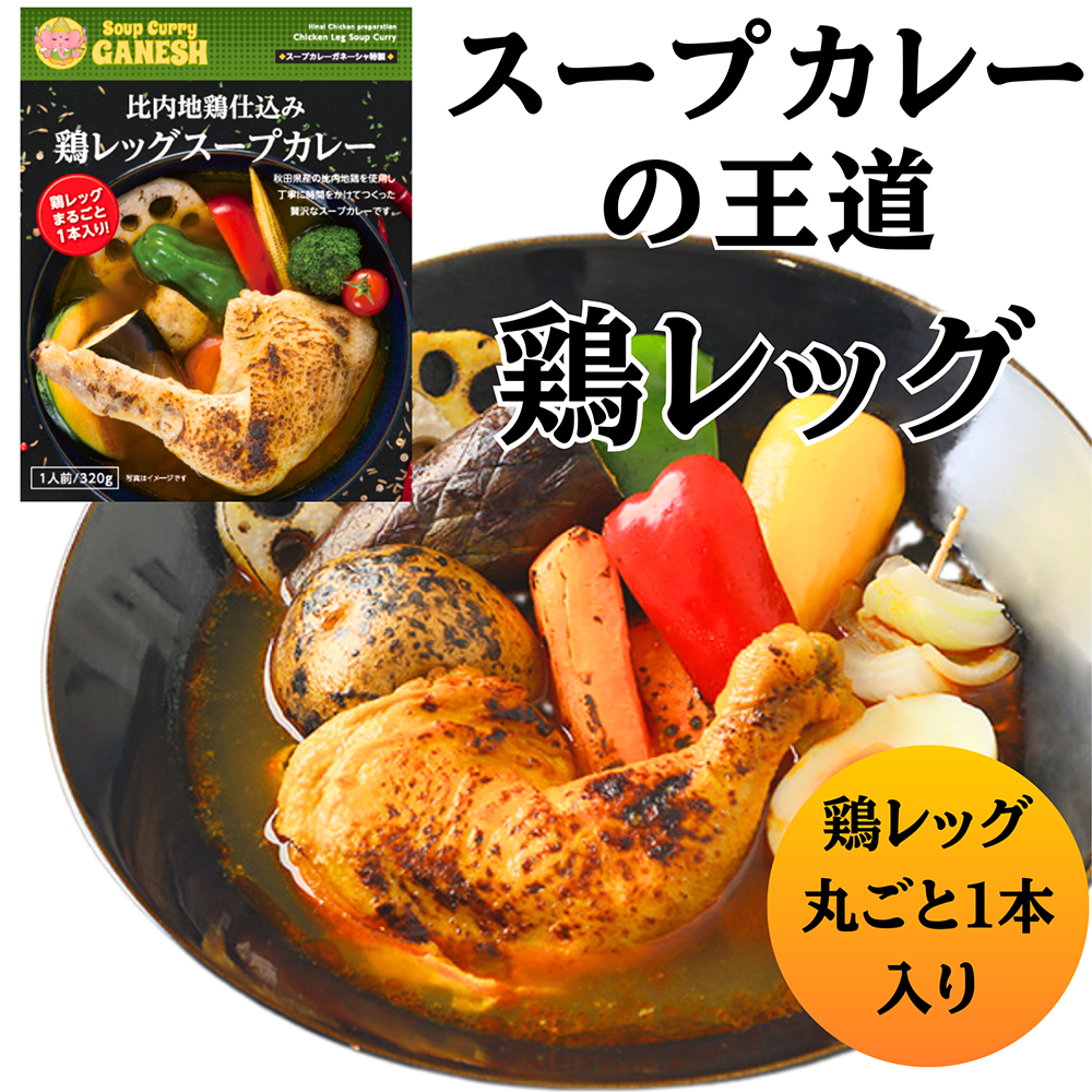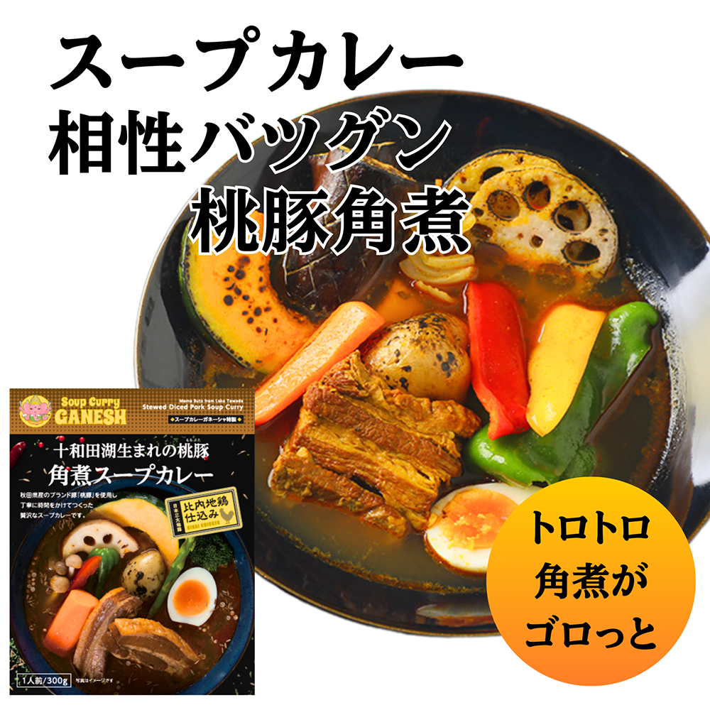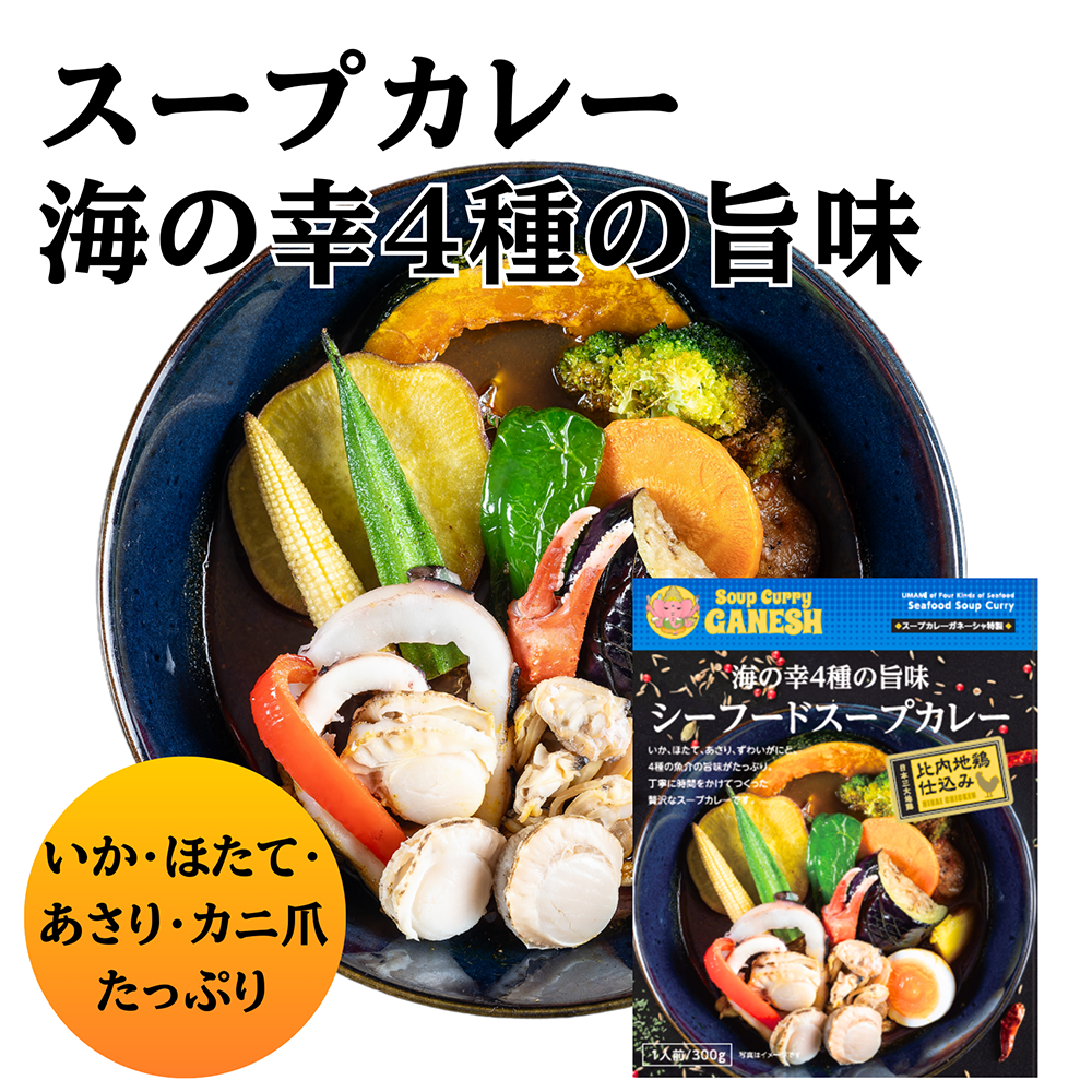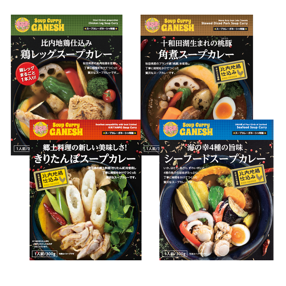 スープカレーガネーシャ特製4種類セットは、比内地鶏ガラを使用した濃厚スープにこだわった贅沢なスープカレーを、自宅で楽しめるセットです。人気の「鶏レッグスープカレー」「桃豚角煮スープカレー」「シーフードスープカレー」「きりたんぽスープカレー」の4種類を詰め合わせ、それぞれの異なる旨味とスパイスの調和を堪能できます。お好きな野菜と一緒にそれぞれのスープカレーを比べてみてください。