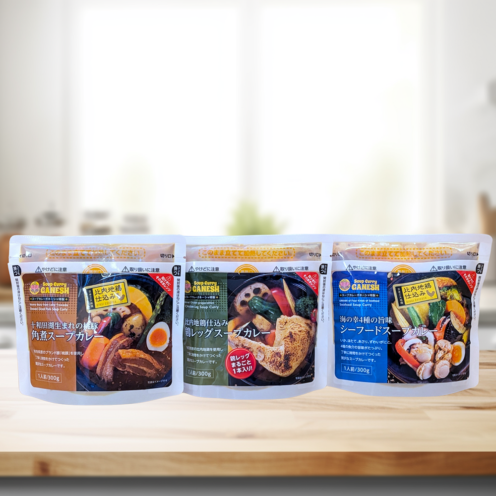 スープカレーガネーシャ特製スープカレーレンジパウチ3種セットは、比内地鶏ガラを煮込んだ濃厚スープにこだわった本格スープカレーを、自宅で手軽に楽しめるセットです。人気の「鶏レッグスープカレー」「桃豚角煮スープカレー」「シーフードスープカレー」の3種を詰め合わせ、それぞれ異なる旨味とスパイスのハーモニーを堪能できます。電子レンジで温めるだけで、お店の味を簡単に再現します。